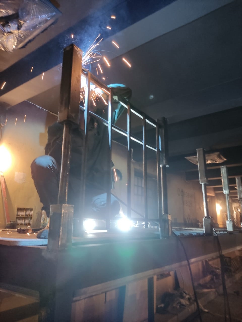 После утверждения проекта мы приступили к реализации задуманного. Работы включали в себя строительство каркаса антресоли, монтаж пола, опор и перил. Установили стильную и безопасную лестницу.